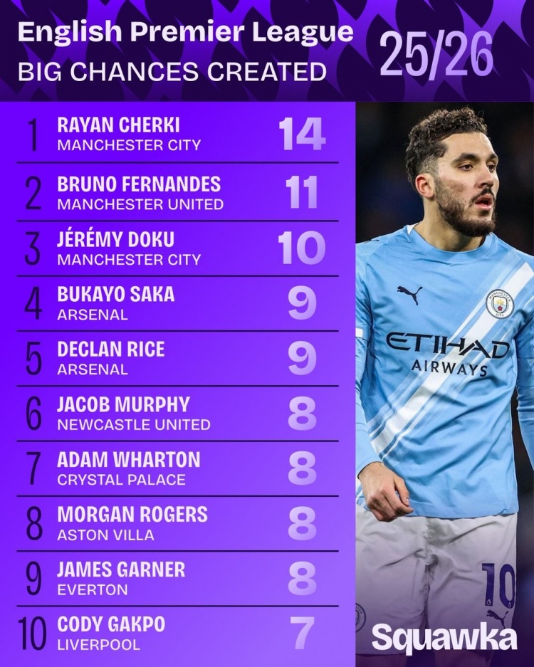 英超创造重大机会榜:谢尔基压B费居首,赖斯、萨卡、加克波在列